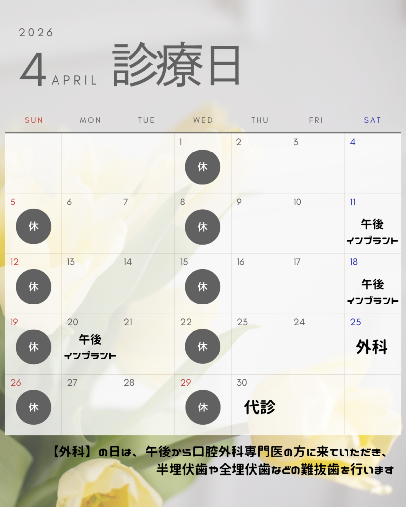 ※外科診療日でも、通常の歯科診療(虫歯治療・歯周病治療・定期検診など)は行っておりますので、どうぞご安心ください😀